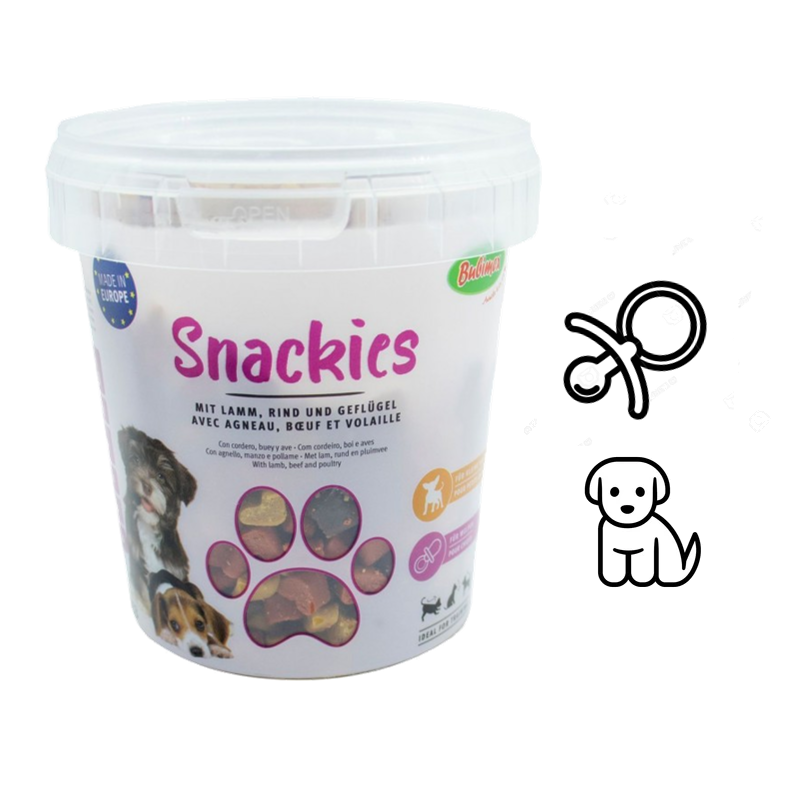 Bubi SNACKIES Agneau Boeuf Volaille de BUBIMEX pour chiot en seau de 500gr