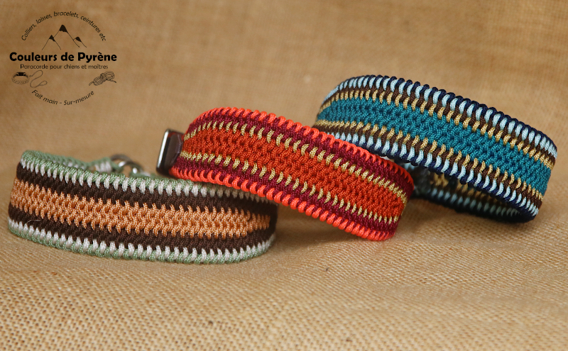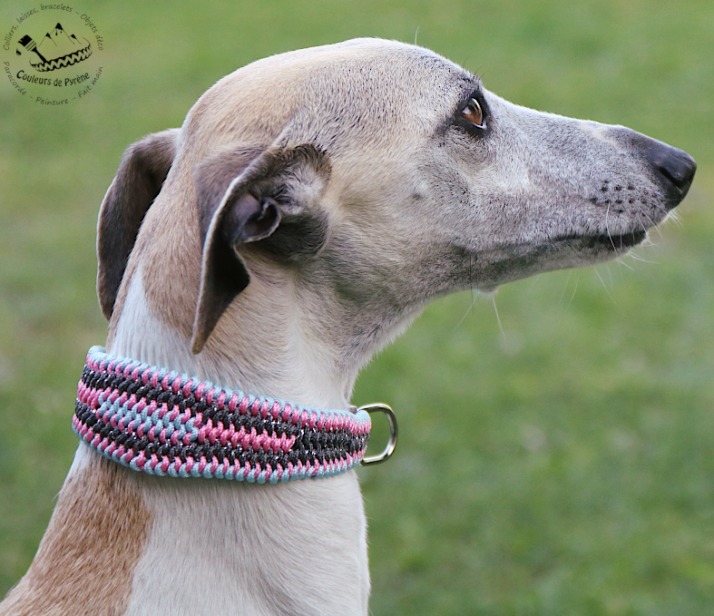 ♥ Le motif BAREGES peut se décliner en version « lévrier », c’est-à-dire un collier évasé, plus large au centre qu’au niveau de l’attache (cf photos) : 3 couleurs au niveau de l’attache et 5 ou 6 au centre. Cela permet d’avoir un collier bien confortable ! Idéal pour les lévriers type PLI et whippet !