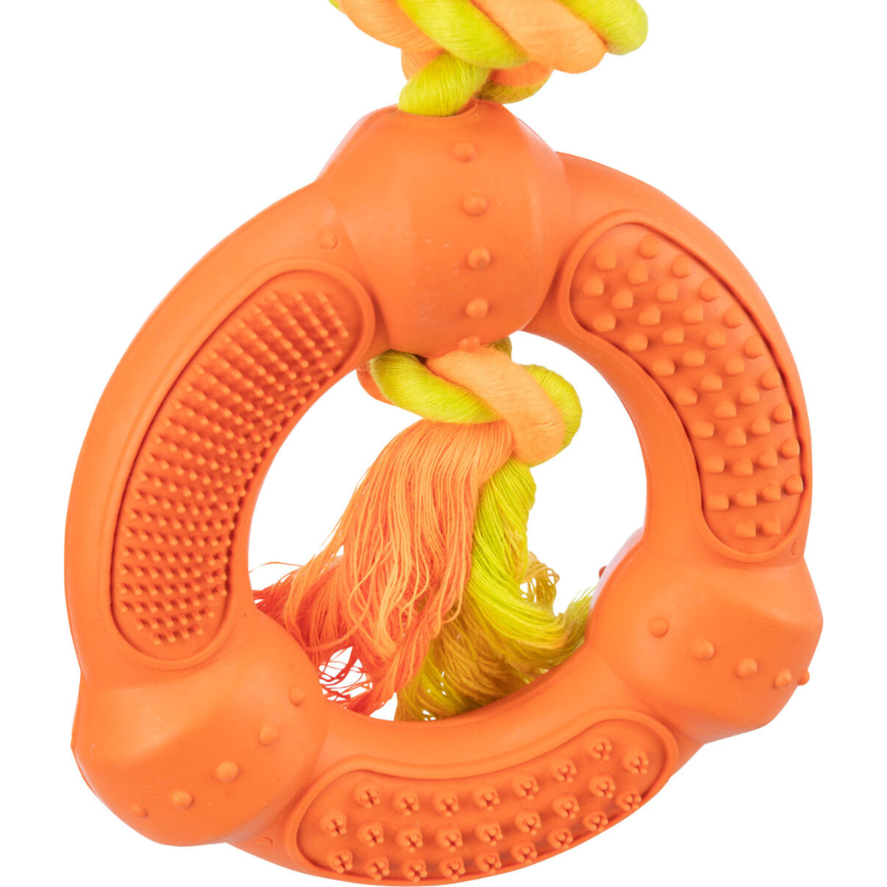 La Corde avec Anneau en Caoutchouc Naturel de la marque Trixie© offre à votre chien, trois activités en une :Tirer, lancer-rapporter et également, « machouiller ». Ainsi les différentes surfaces de l’anneau vont satisfaire son besoin de mordiller; tandis que la corde tressée est idéale pour les jeux de tirage et de lancer.