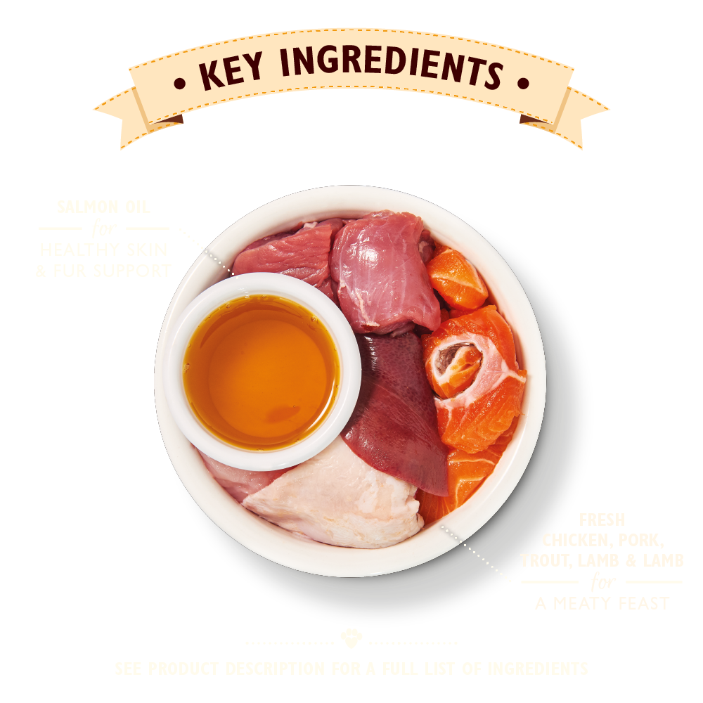 - 60% de viande et de poisson fraichement préparé (poulet 30%, porc 22%, 4% agneau, 4% truite), 4% carottes minéraux, huile de saumon et algues