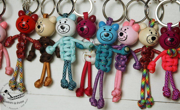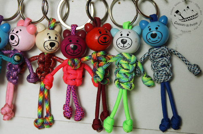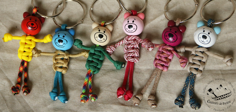 Porte-clés en paracorde en forme de nounours, avec tête en bois peint.