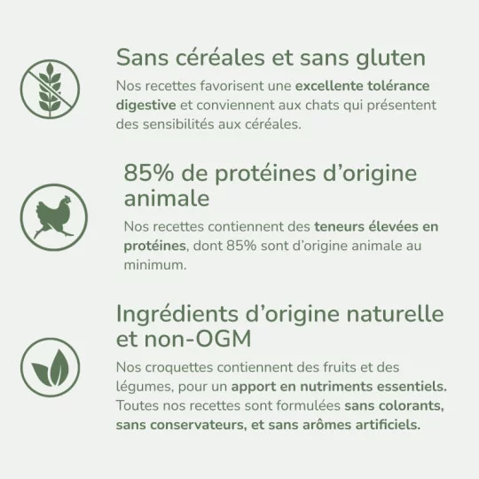 Croquettes sans céréales pour chat stérilisé ou ayant tendance au surpoids. Formulées sans céréales et sans gluten, nos recettes favorisent une excellente tolérance digestive. Elles conviennent aux chats qui présentent des sensibilités aux céréales. La nature carnivore du chat impose un régime riche en protéines d’origine animale. Nos recettes contiennent des teneurs élevées en protéines, dont 85% sont d’origine animale au minimum.